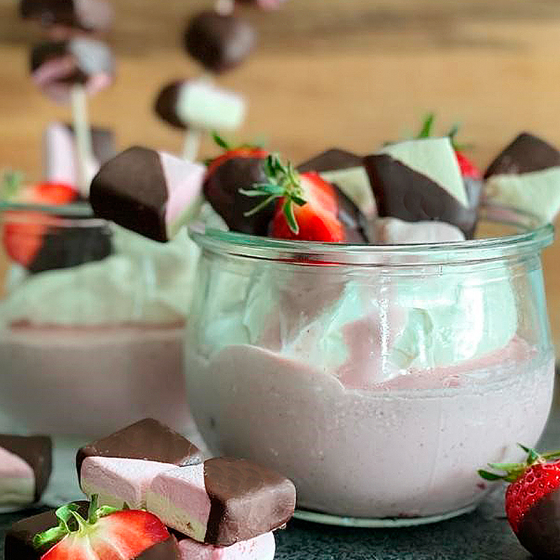 Onze tip voor iedereen die van zoet houdt en van kleurrijke dingen houdt: het verfrissende, fruitige Mallows-roomkwarkdessert met chocoladedip.